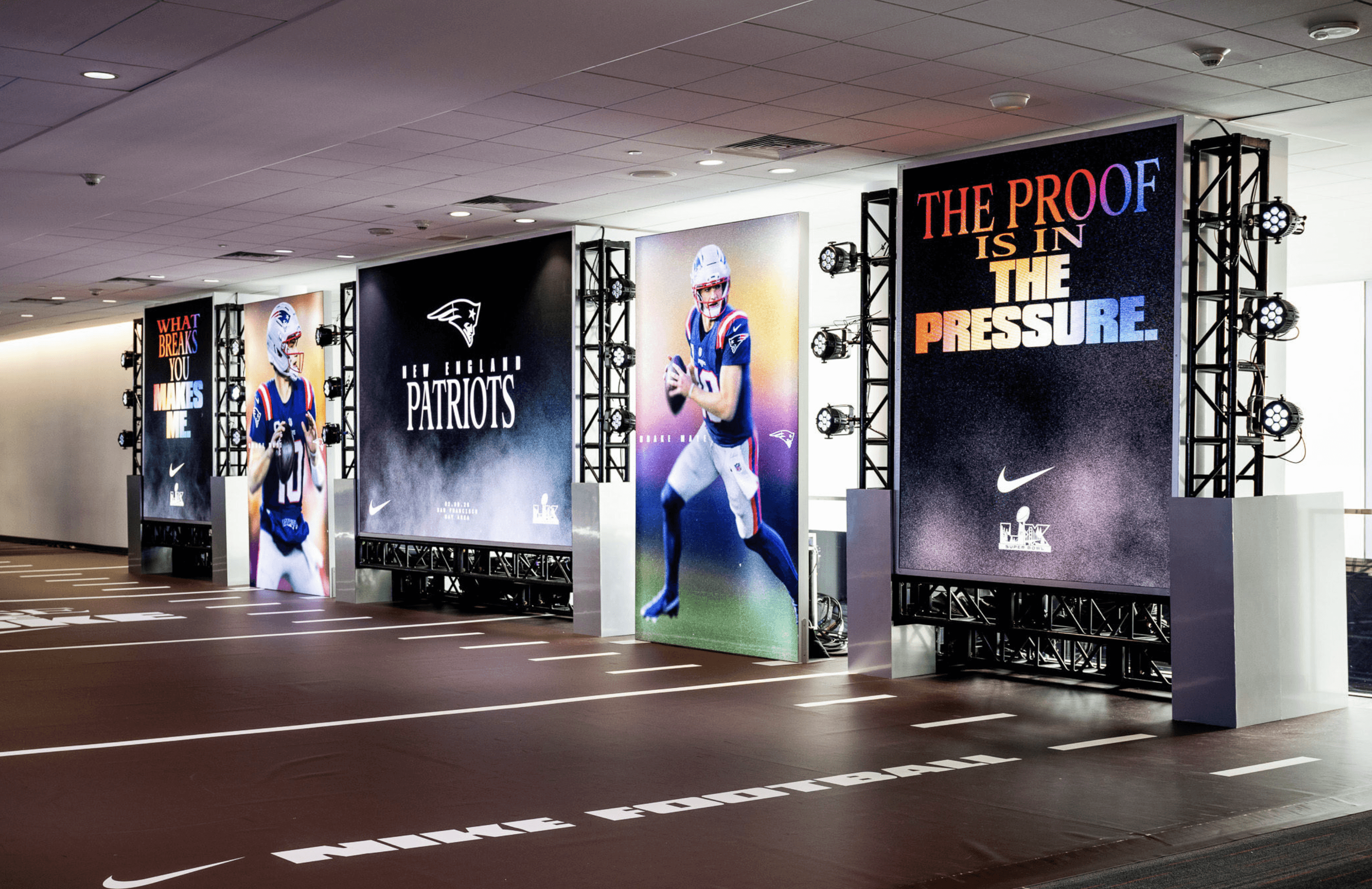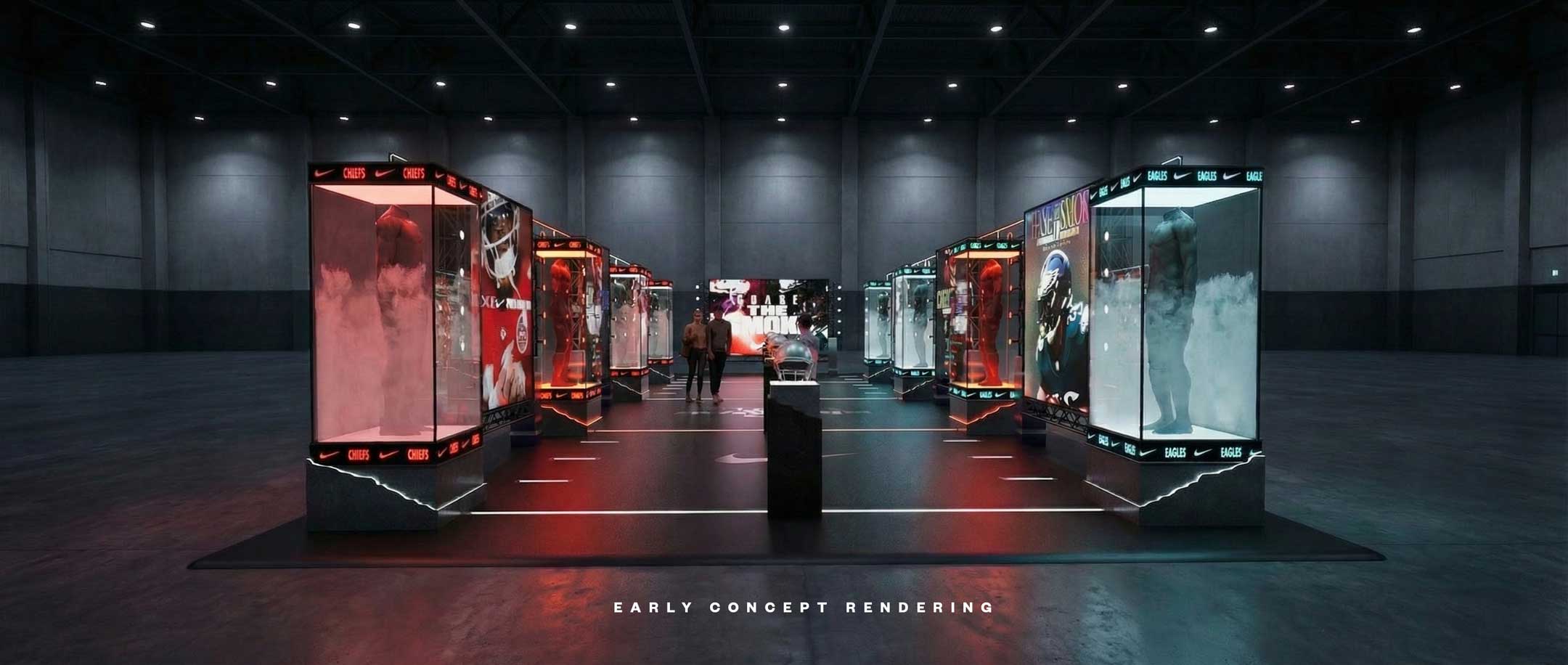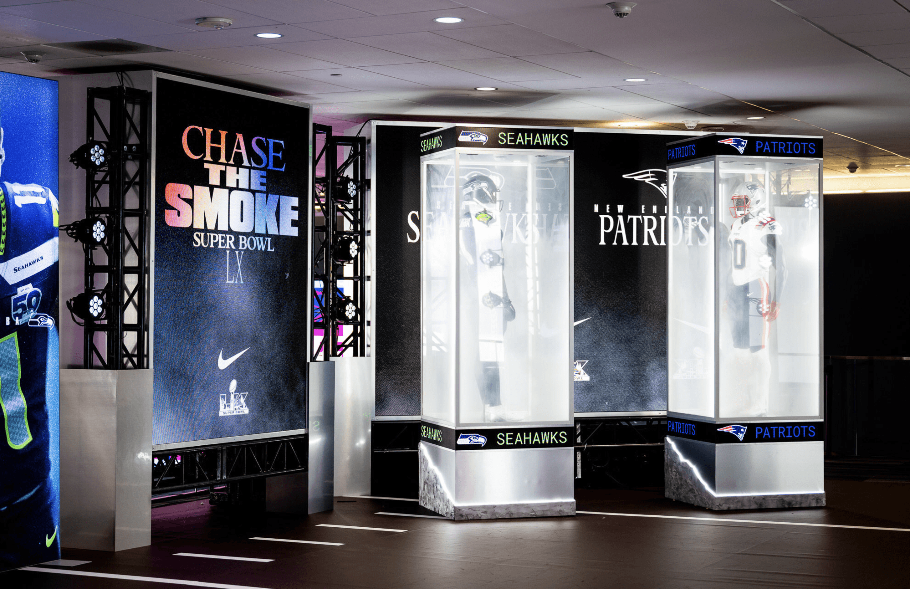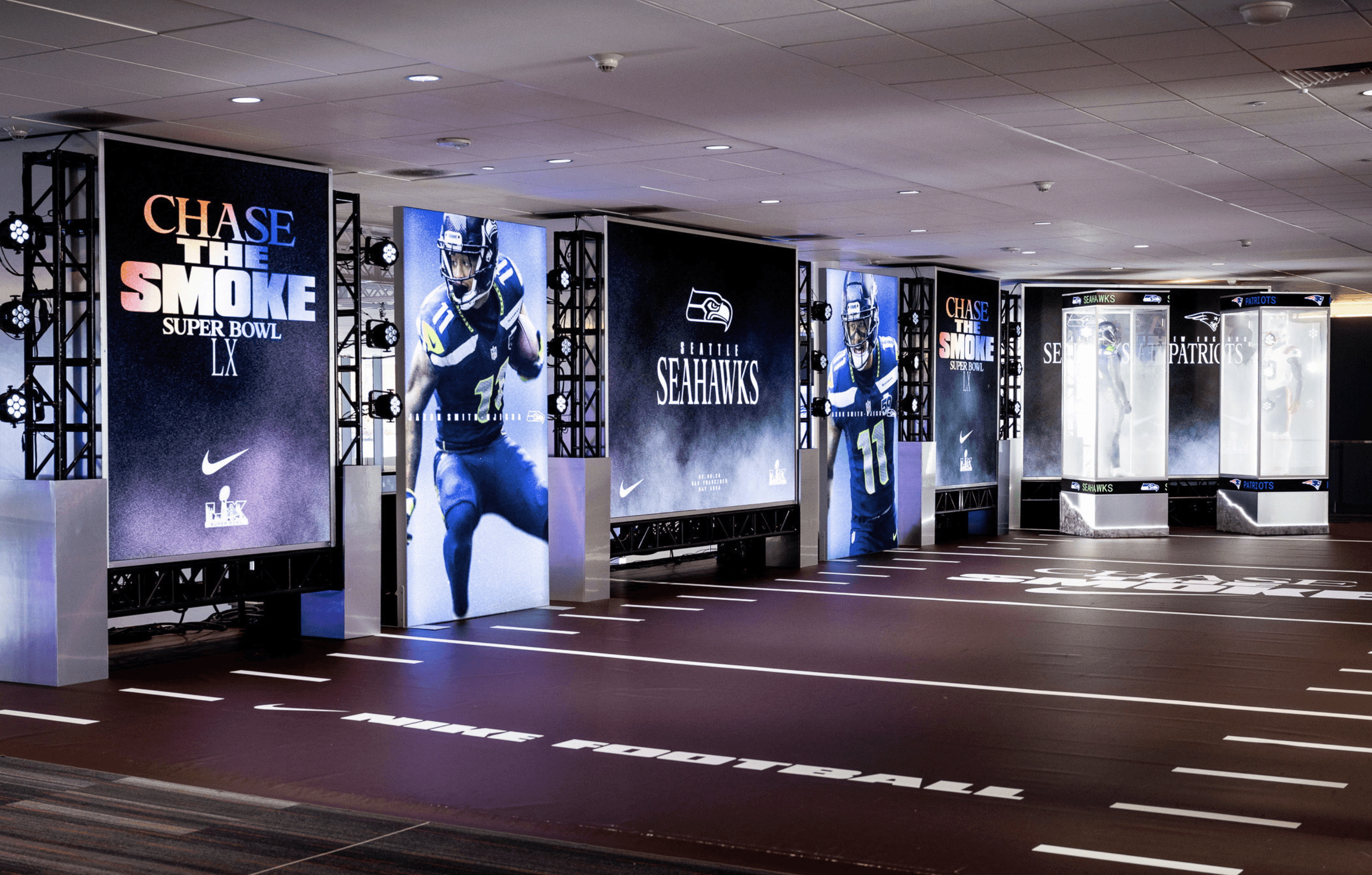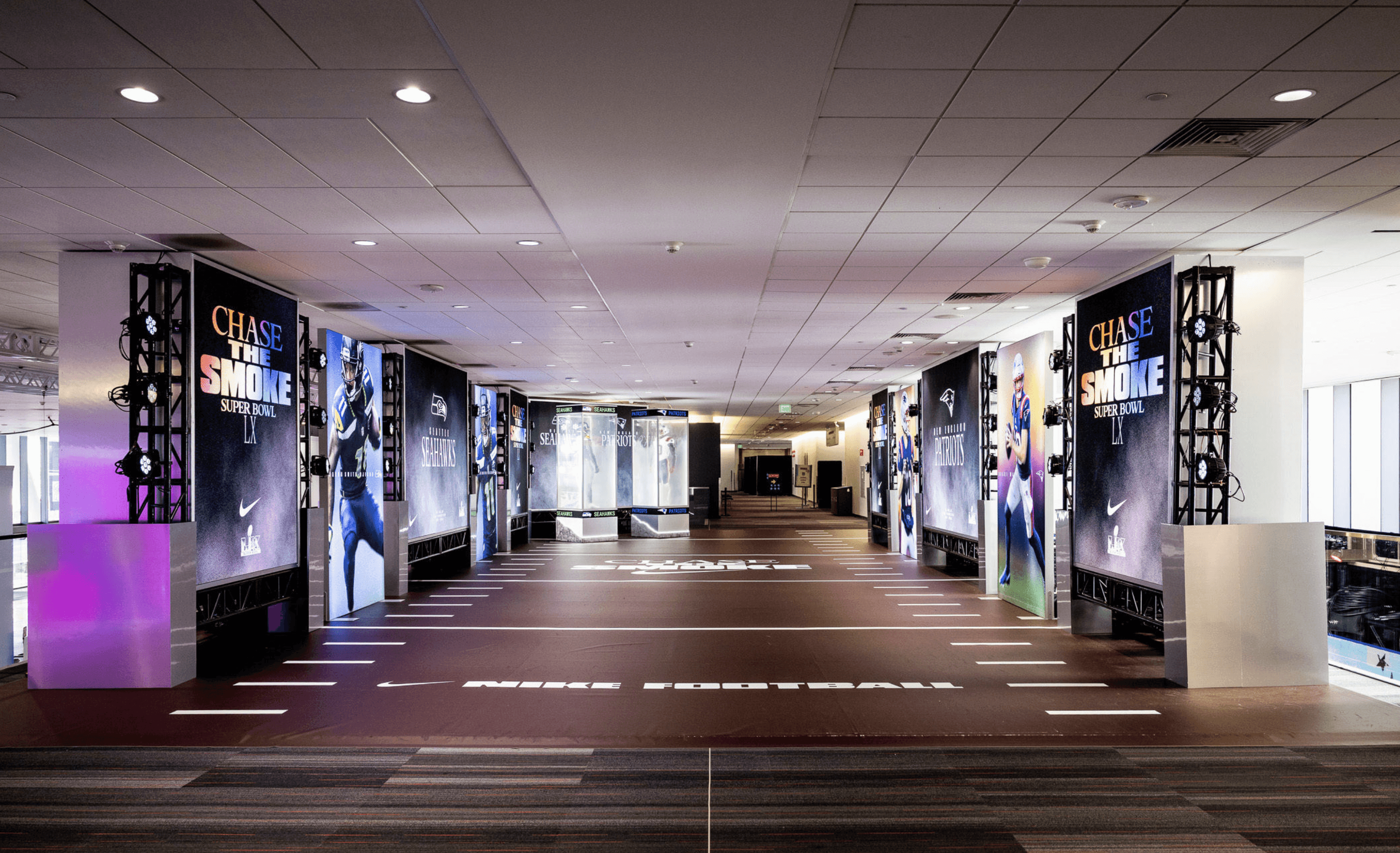 We partnered with Brand Activation Services to bring Nike Football’s “Chase The Smoke” campaign to life as the entry moment for the NFL Experience in Santa Clara at Super Bowl LX. Designed to feel immersive and cinematic rather than a traditional experiential display, the space was framed with industrial blacked-out trussing and layered with dramatic production lighting to create depth, contrast, and anticipation. From the first step inside, fans were surrounded by a high-impact environment that set the tone for the experience beyond.