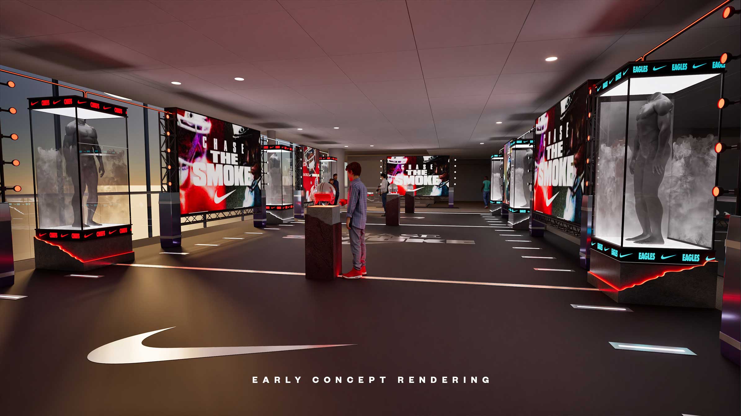 The interplay of controlled lighting, dark structural elements, and atmospheric effects reinforced the campaign’s sense of pursuit and intensity. The result was a visceral, memorable entry experience — one that didn’t just display Nike Football, but embodied the spirit of “Chase The Smoke.”