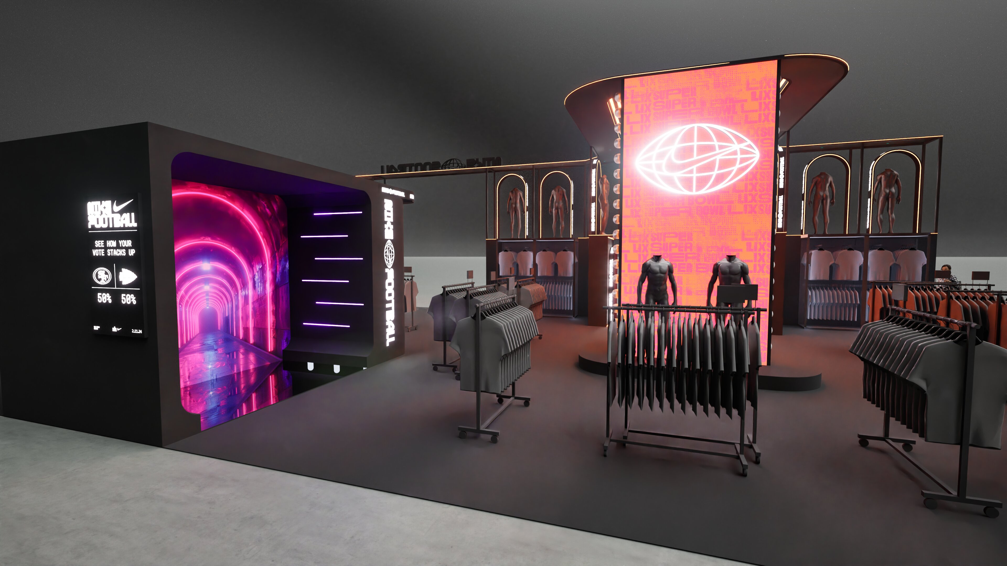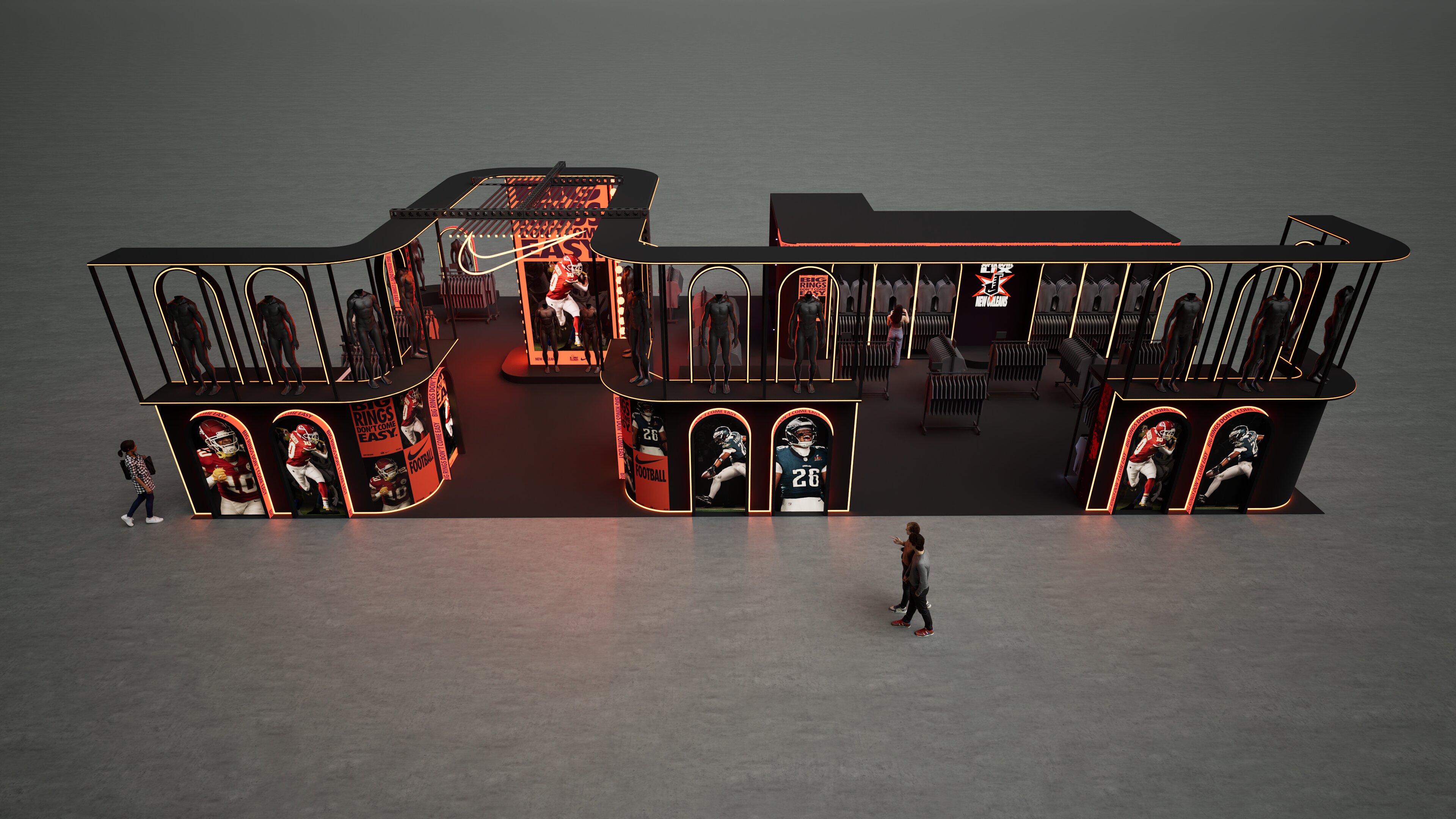 At the NFL Super Bowl LIX Fan Experience, we helped Brand Activation Service and Nike captivate the New Orleans crowd by creating a football-themed shopping experience. This footprint infused the city’s rich culture and architecture while maintaining a modern tech look. Attendees celebrated their fandom while appreciating trend-setting apparel.