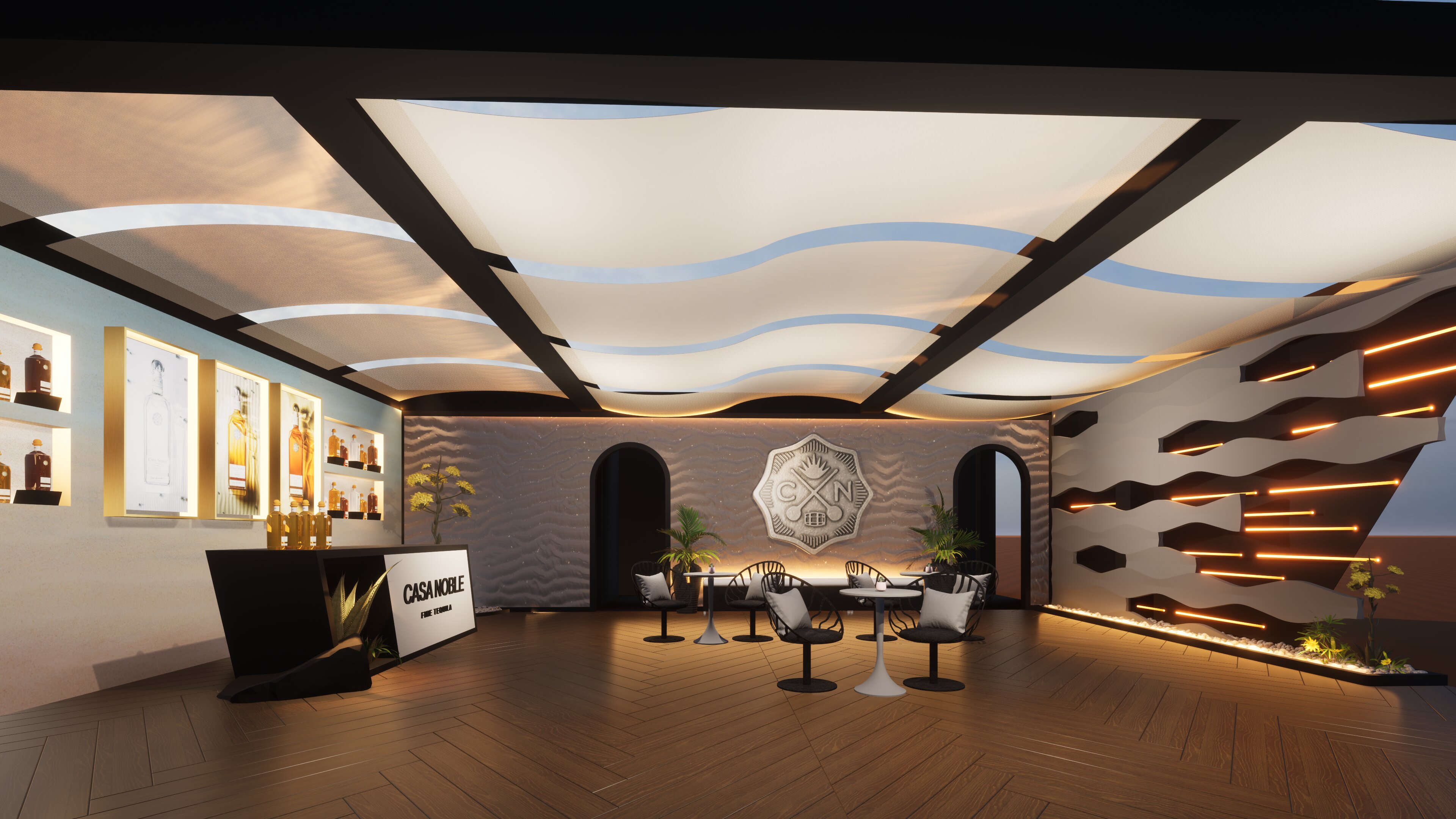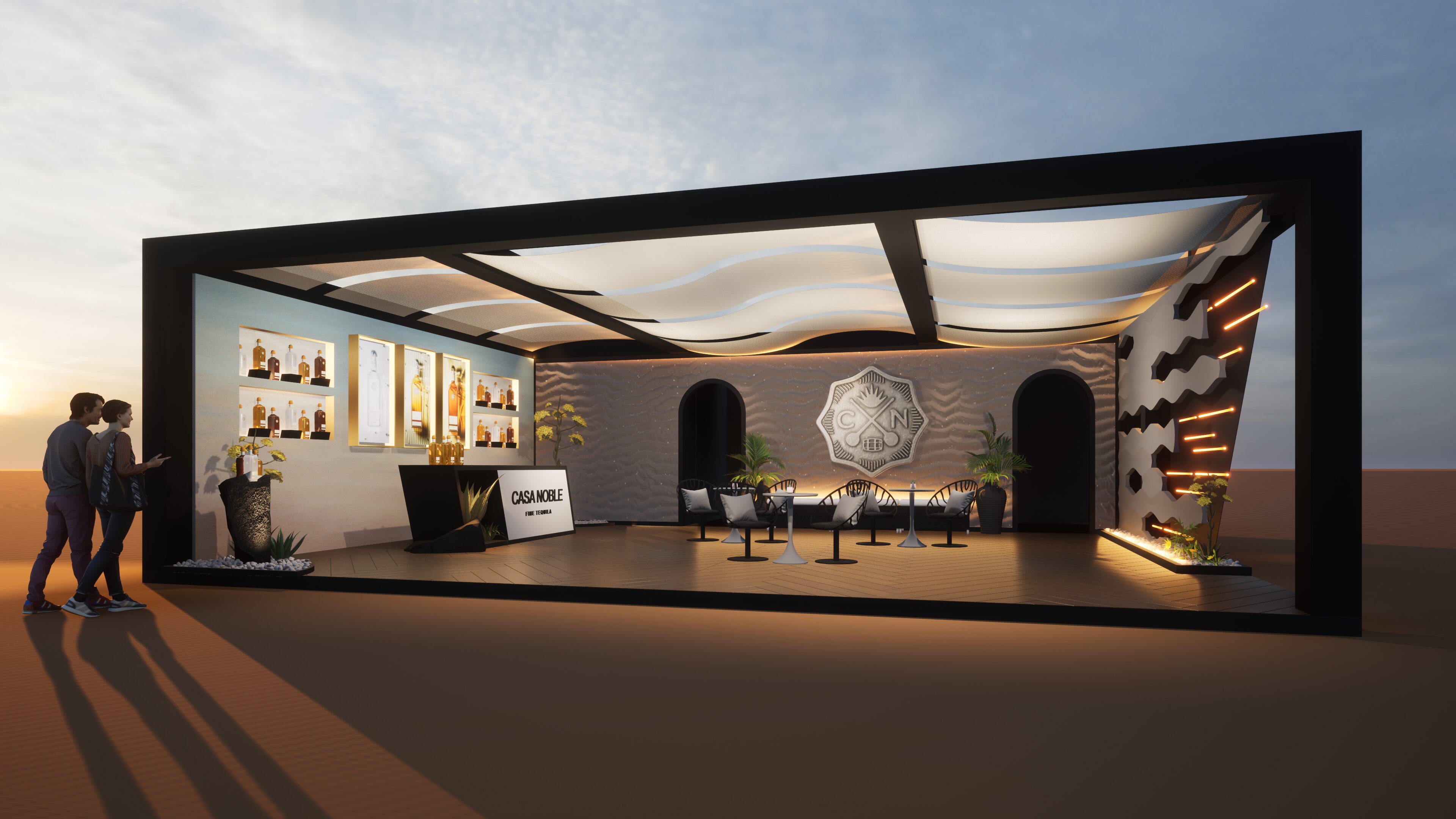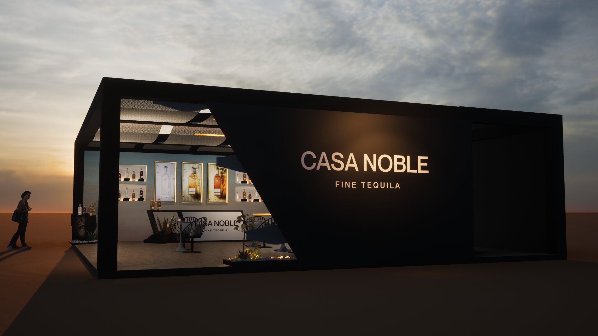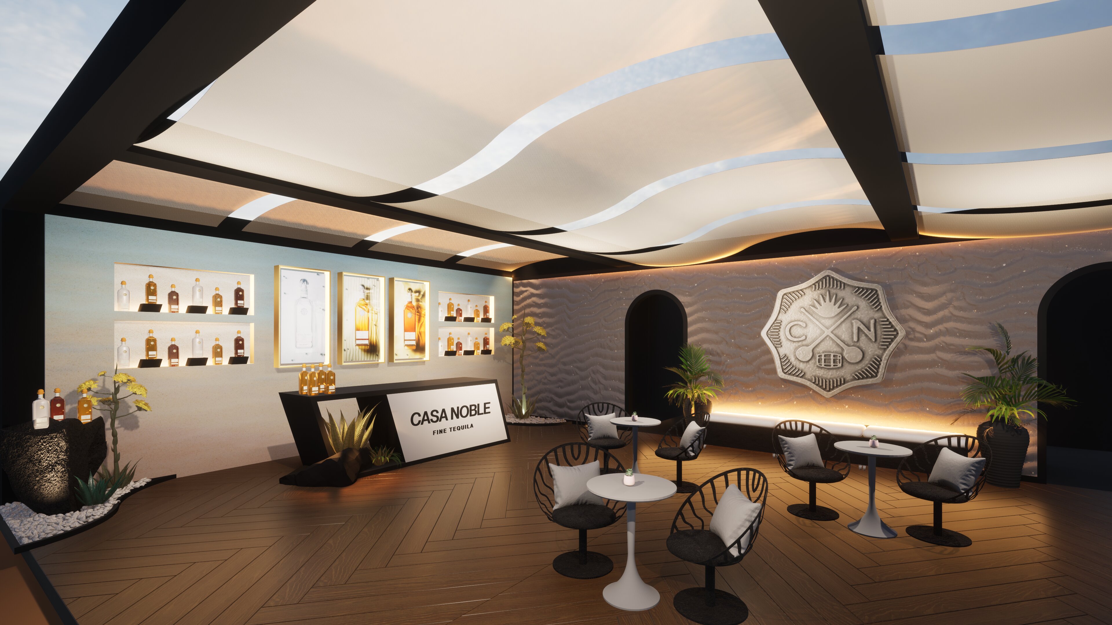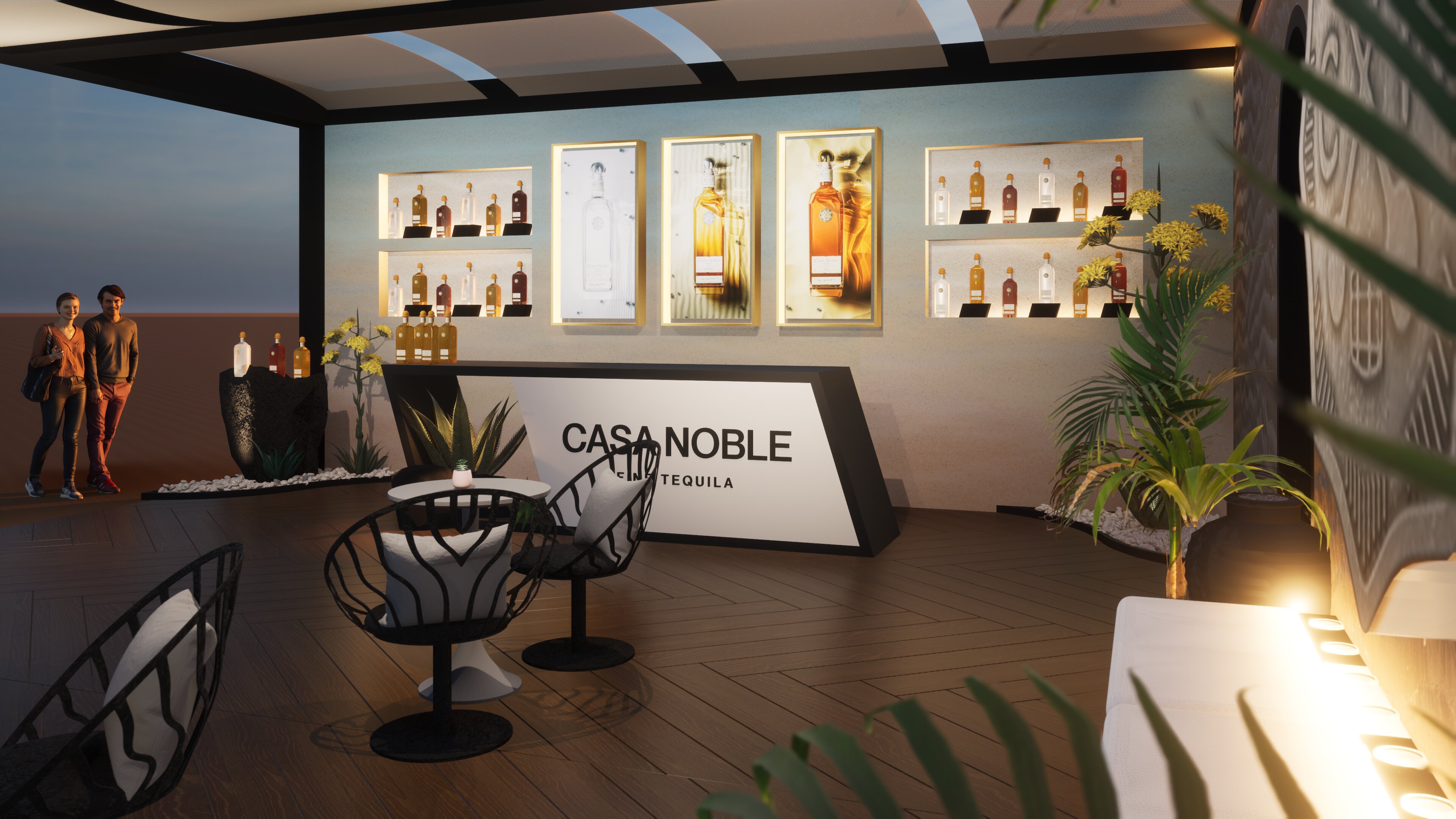 The Casa Noble tequila booth was designed as a striking blend of modern luxury and soulful heritage, inviting guests into a world where refinement meets intrigue. Sleek architectural lines, deep jewel-tone hues, and polished metallic accents created an elevated environment that reflected the brand’s commitment to craftsmanship. The space balanced minimalism with warmth—soft lighting, sculptural bottle displays, and subtle agave-inspired textures guiding visitors through a sensorial journey rooted in premium tequila culture.